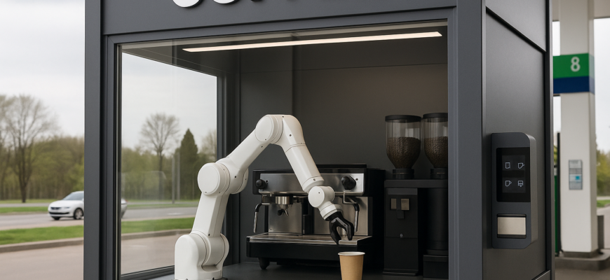 На автозаправочной станции сети А-100 в Новодворском сельсовете, недалеко от Минска, начала работу необычная точка с кофе, где вместо человека за стойкой используется механическая рука-манипулятор. Об этом сообщает местное издание pristalica.by. Роботизированная установка размещена непосредственно на территории автозаправки и предназначена для приготовления напитков стандартного кофейного меню.