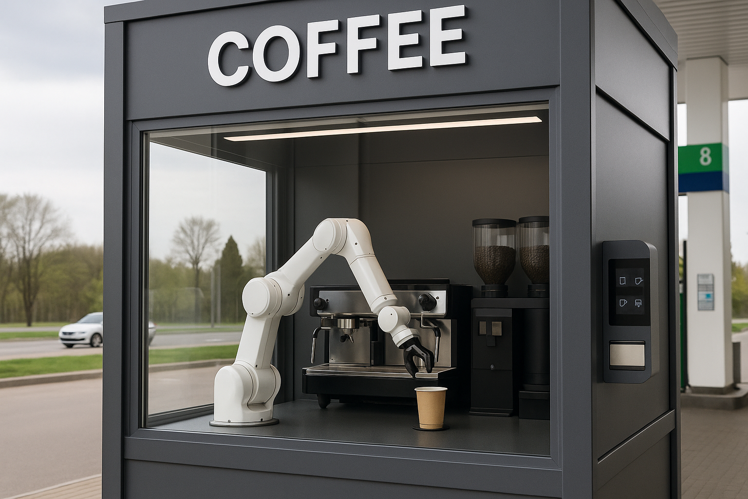 Установка роботизированной руки на автозаправке оформлена в виде небольшого шоу с музыкальным сопровождением: демонстрация работы механизма происходит в сопровождении звуков и движений, что делает процесс заметным для проезжающих мимо водителей и посетителей станции. При этом конструкция и интерфейс рассчитаны на самостоятельное обслуживание: покупатель выбирает параметры на панели, подтверждает выбор и получает готовый напиток по завершении цикла приготовления.